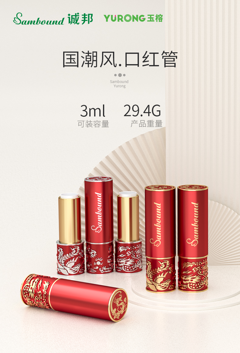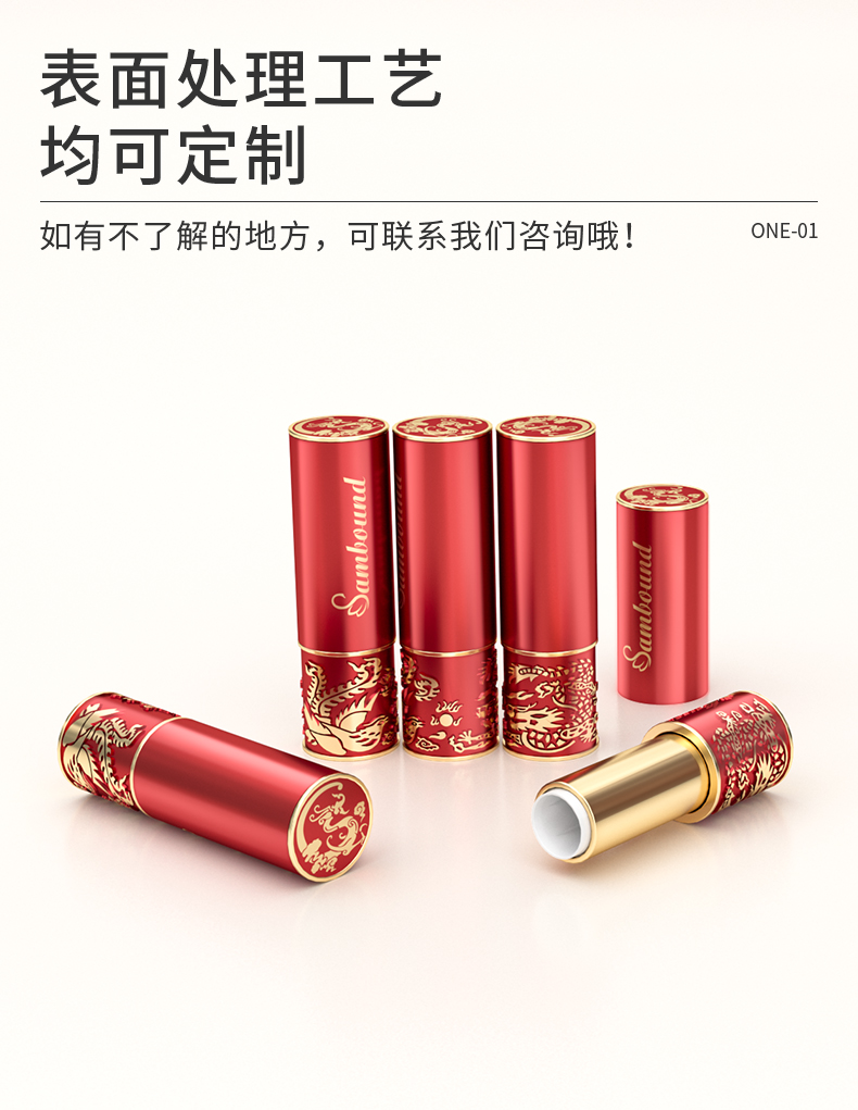 廠家定制圓形國(guó)潮風(fēng)口紅空管龍鳳口紅管包材,化妝品包材加工定制,我們可以做各種各樣的裝飾,從金屬化,hs,噴涂,uv涂層,電鍍等,也可以注射任何顏色