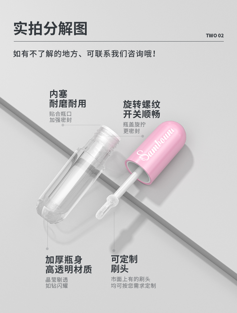 這款膠囊設(shè)計空唇泥管特點:加厚瓶身高透明材質(zhì),可定制刷頭、顏色及l(fā)ogo,容量3 85ml