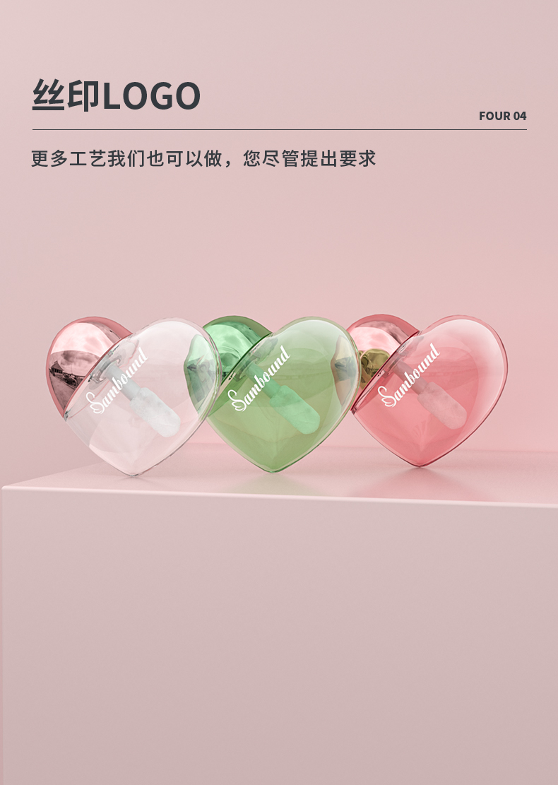 這款心形唇彩管特點(diǎn):6ml容量,瓶身注塑透明色,蓋子可以電鍍玫瑰金、銀色以及其他顏色,也可以定制logo,化妝品包材廠家直供,可以滿足各種自定義要求。