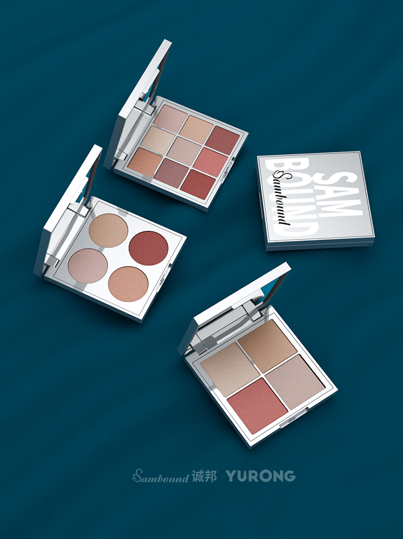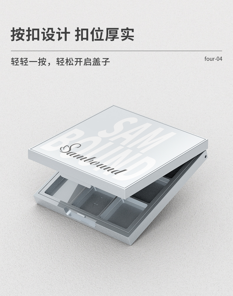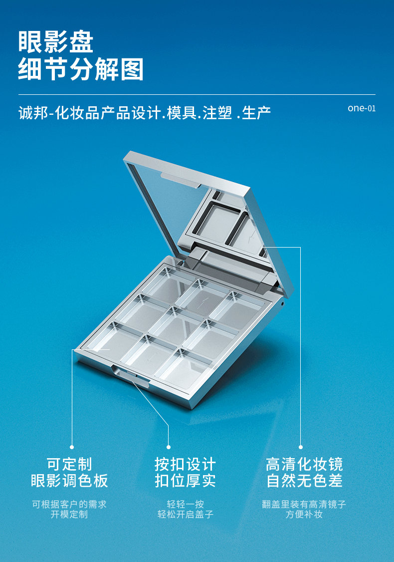 東莞誠邦化妝品包材廠家定制的這款9宮格眼影盤采用銀色電鍍工藝,奢華有質(zhì)感,并且使用按扣開關(guān)設(shè)計,方便操作??梢远ㄖ莆淖謑ogo