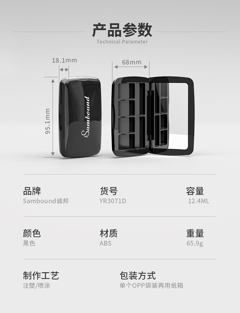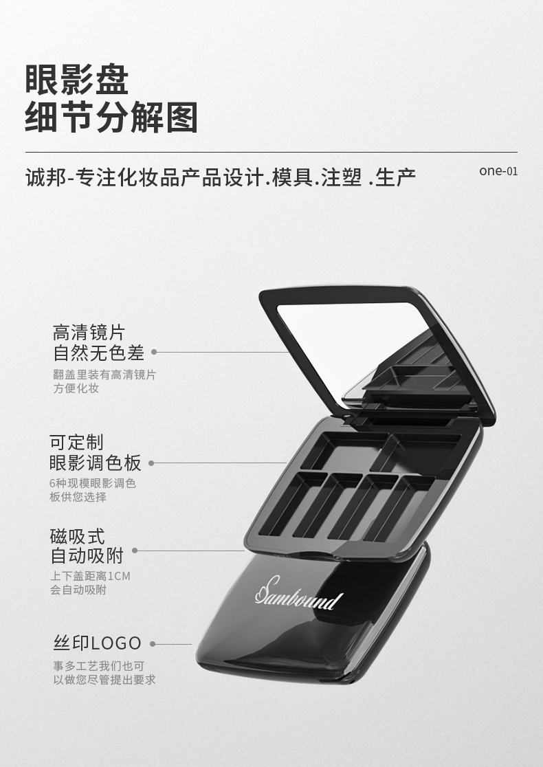這款黑色6色眼影盤特點(diǎn):采用磁吸開關(guān)、有多種內(nèi)格可供選擇、可按照客戶的要求定制logo和顏色,高清鏡片自然無色差。廠家供應(yīng)注塑加工