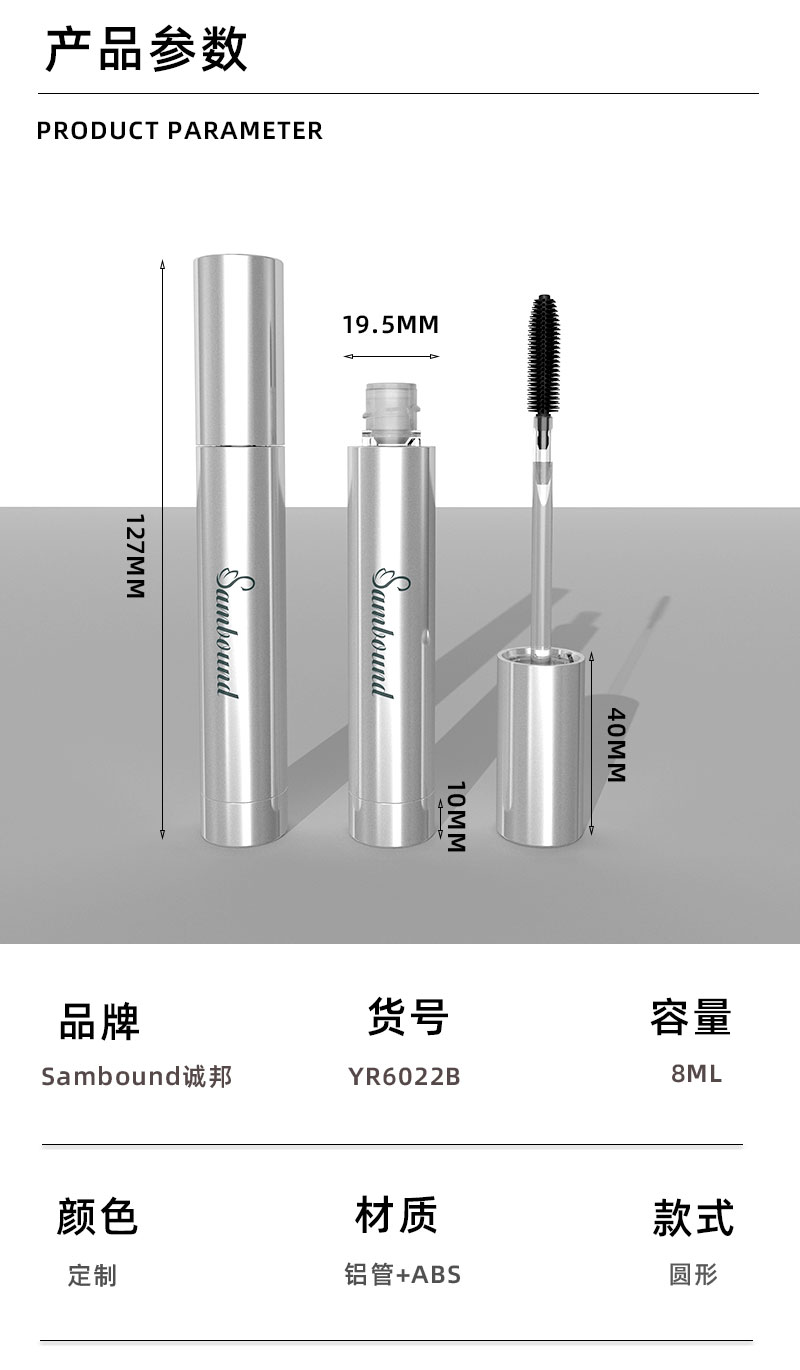產(chǎn)品名稱睫毛膏管包材產(chǎn)品貨號(hào)YR6022B容量8ML顏色銀色-可定制材質(zhì)ABS+鋁重量32 9g制做工藝注塑 噴油 真空電鍍包裝方式單個(gè)OPP袋裝再用紙箱