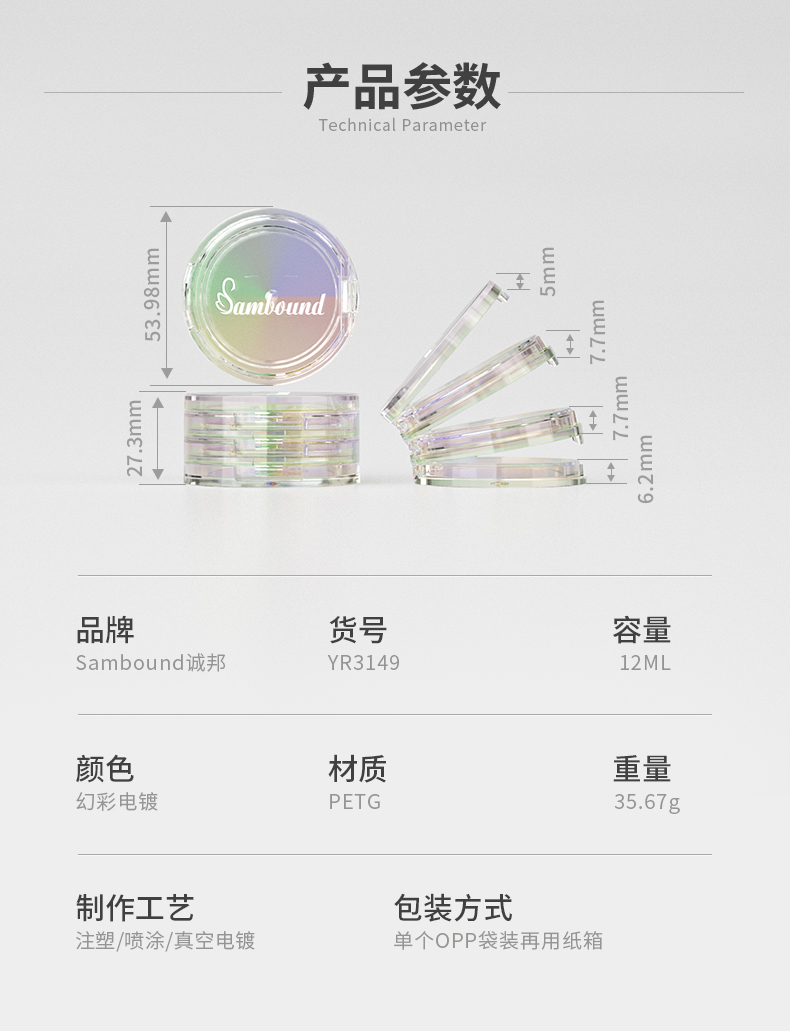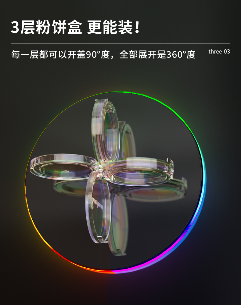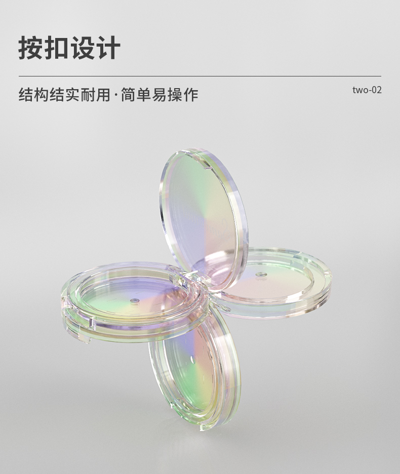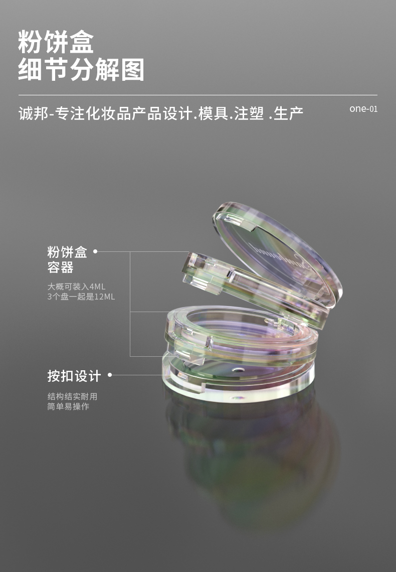三層透明空粉餅盒化妝品包材廠家,該產(chǎn)品特點:可以電鍍炫彩,也可以根據(jù)客戶需求定制透明或者其他顏色,產(chǎn)品的層數(shù)可以疊加。
